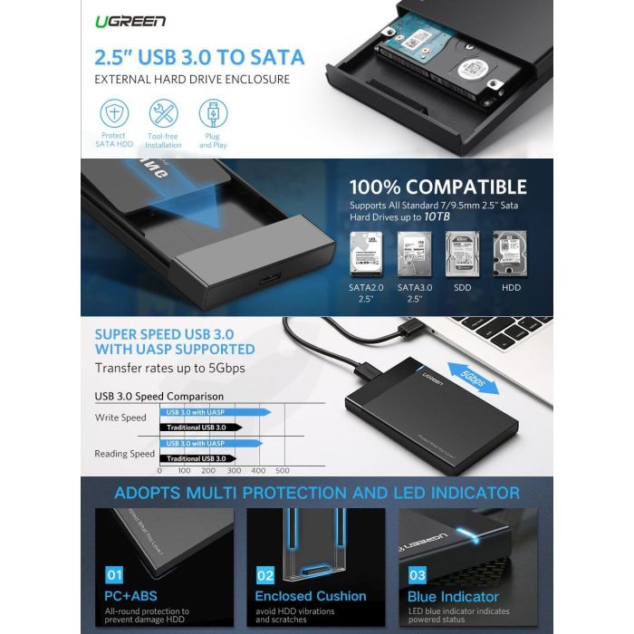 Idealen za uporabo vašega starega 2,5-palčnega trdega diska in trdega diska SSD kot zunanjega pogona USB. Zagotovil vam bo večjo priročnost uporabe in vsestranskost shranjevanja digitalnih podatkov.